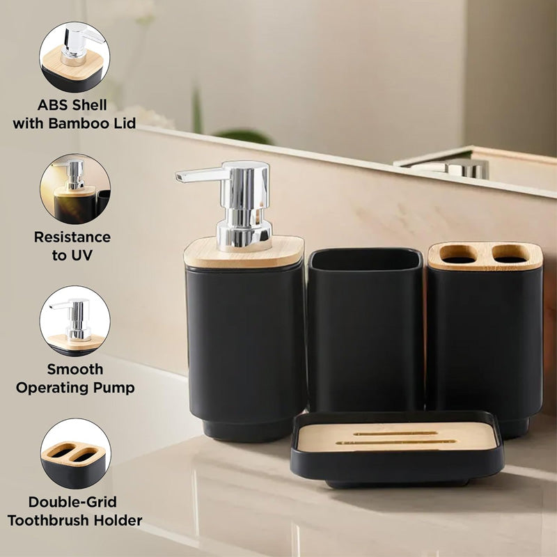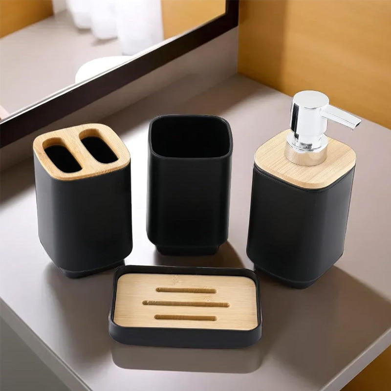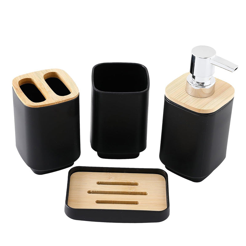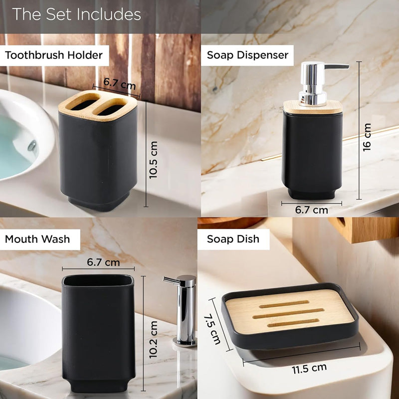 - ABS plastic and natural bamboo perfect match, not only light weight to make you convenient to use, but also beautiful and durable not easy to break; The soap dispenser you can press with one hand, will automatically rebound, Toothbrush holder suitable for most sizes of toothbrush, toothbrush paste.