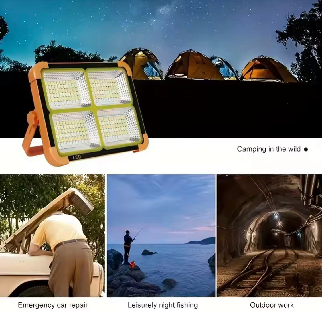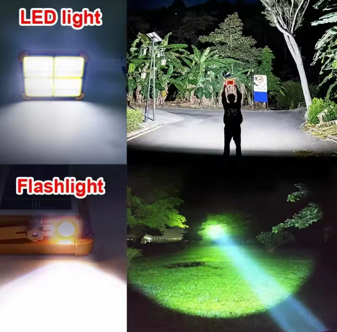 This rechargeable outdoor LED solar floodlight with 500W is a powerful and energy-efficient lighting solution, perfect for camping, emergency use, and outdoor work. Equipped with a built-in mobile charging port, it allows you to charge your devices on the go. The solar panel ensures eco-friendly, cost-free charging, while the high-brightness LED spotlight provides reliable illumination in dark environments. Durable, weather-resistant, and portable, this floodlight is ideal for all your outdoor lighting needs.